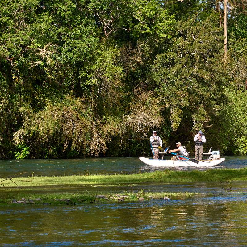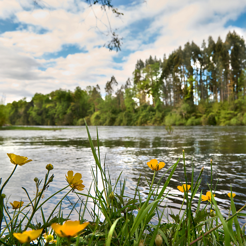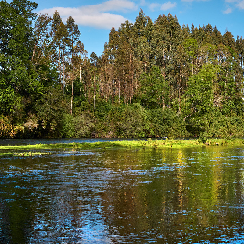 Desde todas las parcelas se llega fácilmente a la ribera del imponente Río Rahue. Allí, uno puede fluir nadando en sus aguas transparentes, disfrutar de la pesca deportiva o simplemente observar cómo garzas y patos silvestres surcan el aire, mientras el pato carroñero ronda curioso por la orilla.